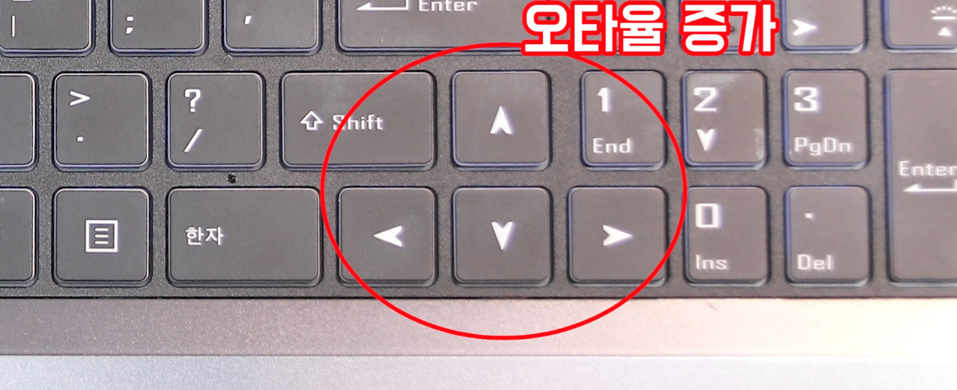 먼저 방향키 위에 페이지 업,다운 키가 너무 타이트하게 붙어있어서 이부분의 오타율이 증가할 수 밖에 없습니다.