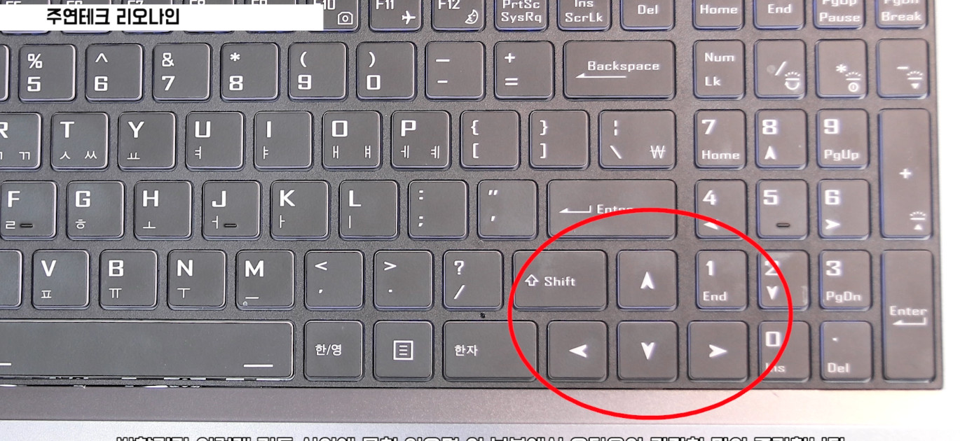 방향키는 다른 키들 대비 좀 더 내려 위치 시킴으로써 구분감을 주고 있습니다. 노트북에서 가장 효율적으로 방향키 구분감을 주는 방식이지만 제작 단가가 증가하기 때문에 게이밍 노트북들과 같이 방향키가 특별히 중요한 노트북이 아니고 서는 사용되지 않는 방식입니다.