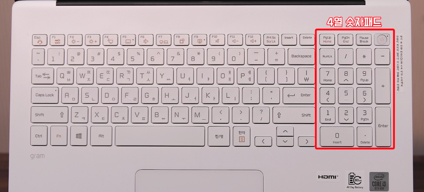 제가 가지고 있는 그램17 아이스레이크 모델은 4열 숫자패드를 가지고 있고, 숫자패드와 문자패드 사이에 약간의 구분감이 있기 때문에 숫자패드 사용성이 좀 더 좋습니다. 같은 17인치라도 코멧레이크 모델은 이 구분감이 없습니다.