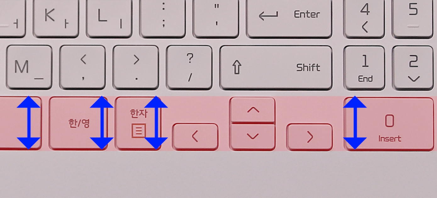 하지만 제일 아래줄에 있는 키들의 세로 사이즈를 전체적으로 늘리면서 스마트하게 방향키 사이즈를 확보했습니다. 단순하면서도 영리한 방법이죠.