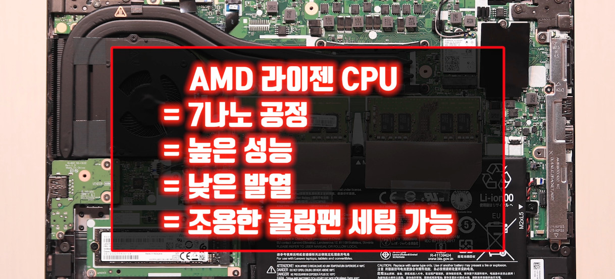 라이젠은 인텔 대비 더욱 더 정밀한 공정의 CPU 제작으로 성능 뿐만 아니라 발열에서도 좋은 모습을 보여주고 있습니다. CPU의 발열은 노트북의 냉각 시스템과 바로 연결 되고 좀 더 조용한 쿨링 팬 세팅이 가능하죠.