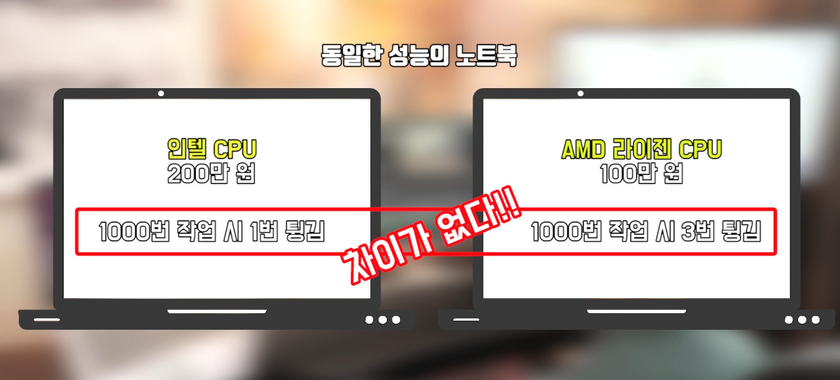 성능이 동일한 200만 원짜리 인텔 노트북과 100만 원짜리 라이젠 노트북이 있습니다.