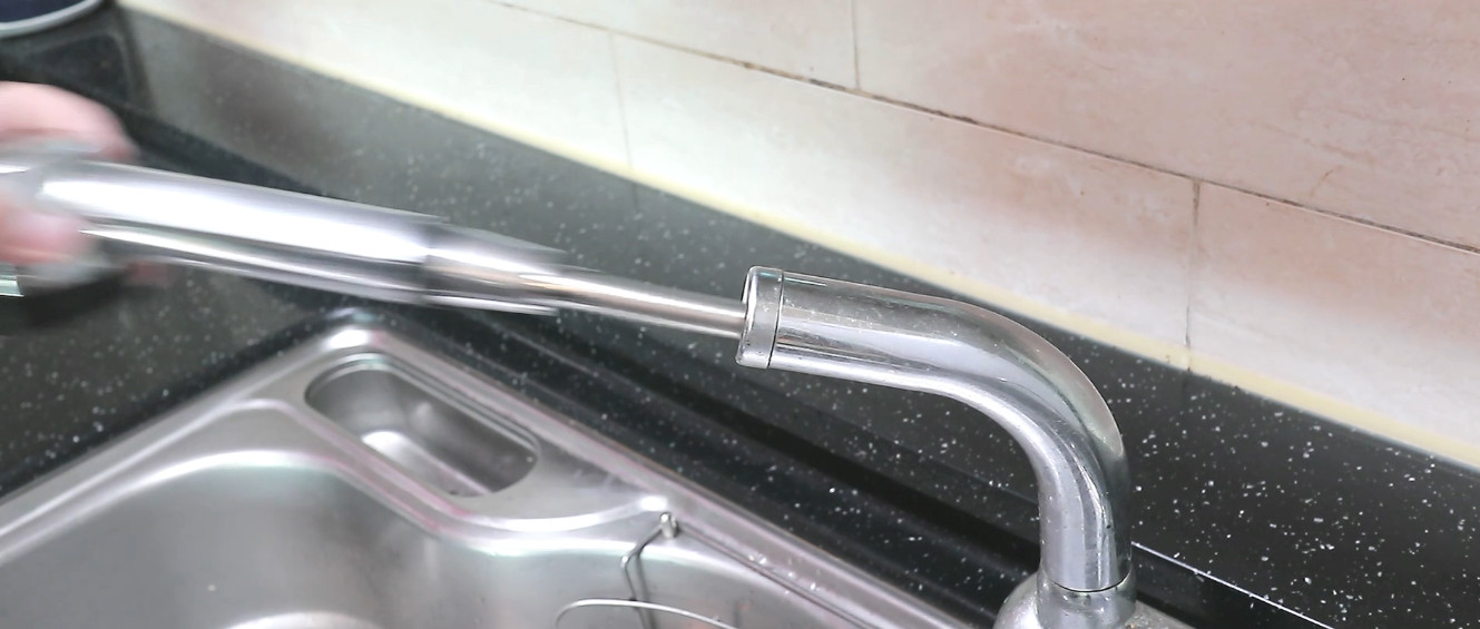 스프레이형 수전은 이렇게 늘어난 다음 자동으로 다시 들어갑니다.