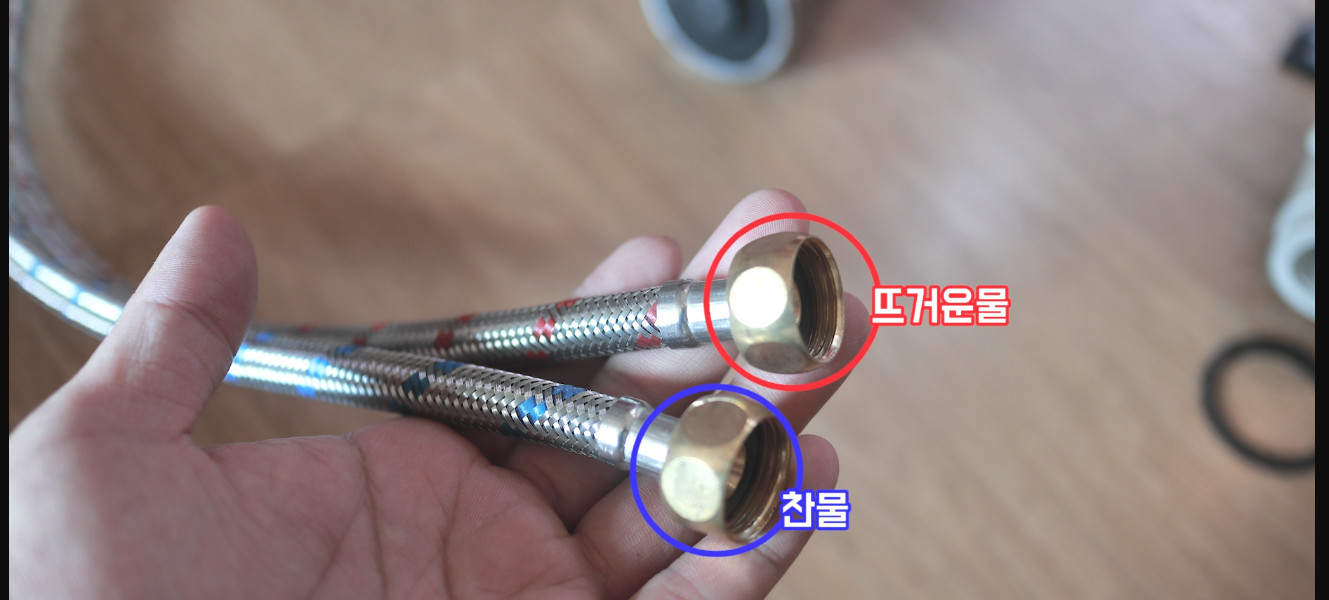 호스는 2개가 보이는데 찬물은 파랑색, 뜨거운 물은 빨강색으로 표시 되어있고,