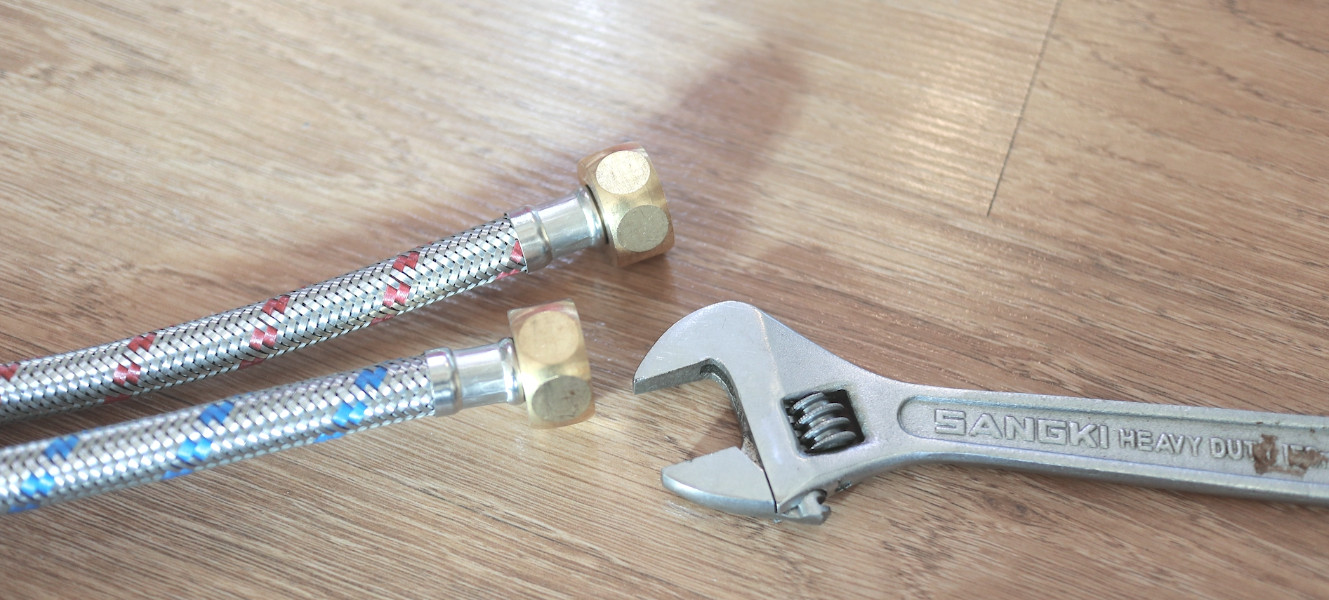 온수는 온수 수도꼭지에, 냉수는 냉수 수도꼭지에 몽키스패너를 이용해서 결합하면 수전 설치는 끝납니다.