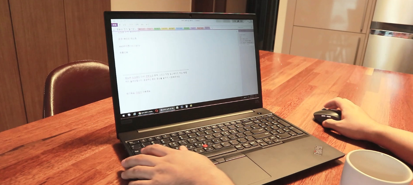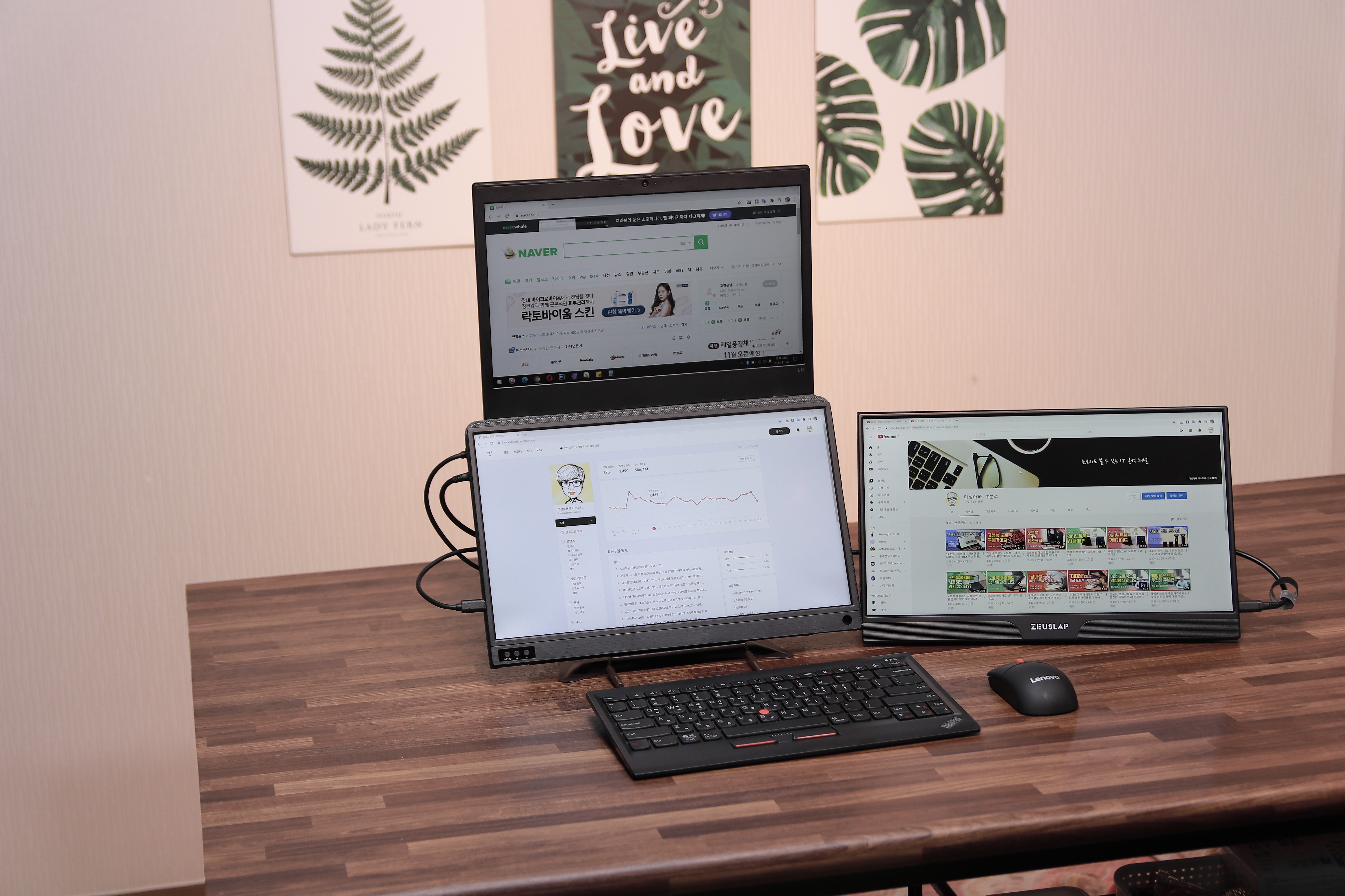 장시간 중요한 작업을 해야 된다면 트리플 모니터를 사용하기도 합니다. 보기에는 좀 이상해 보일 수 있겠지만 데스크탑으로 작업하는 것과 비슷한 작업 효율이 나오기 때문에 종종 이렇게 사용하곤 합니다.