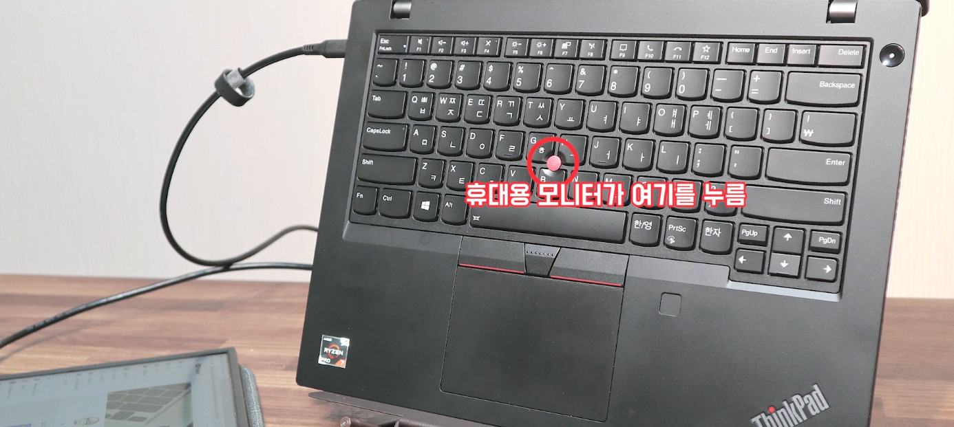 제가 자주사용하는 노트북은 씽크패드인데, 이렇게 세팅하면 휴대용 모니터가 빨콩을 계속 누르고 있기 때문에 필히 공간을 띄어줘야 합니다.