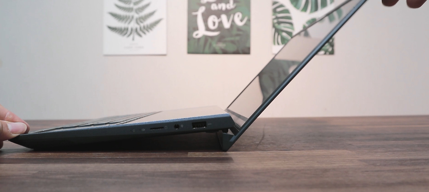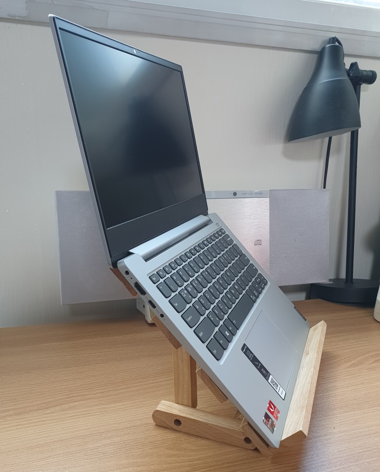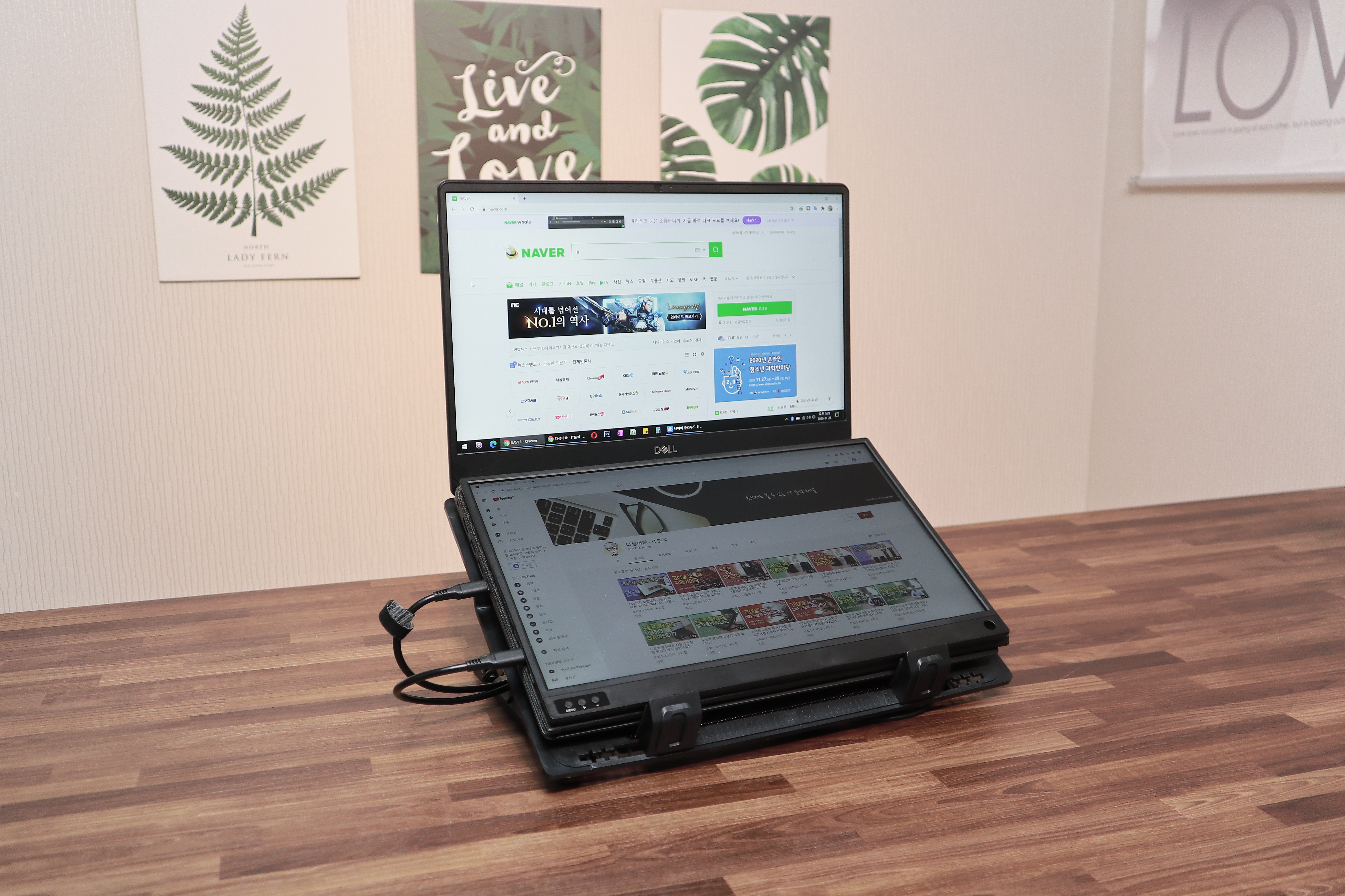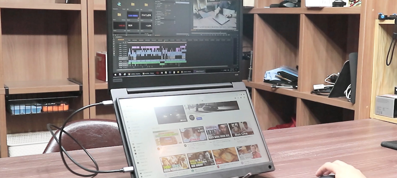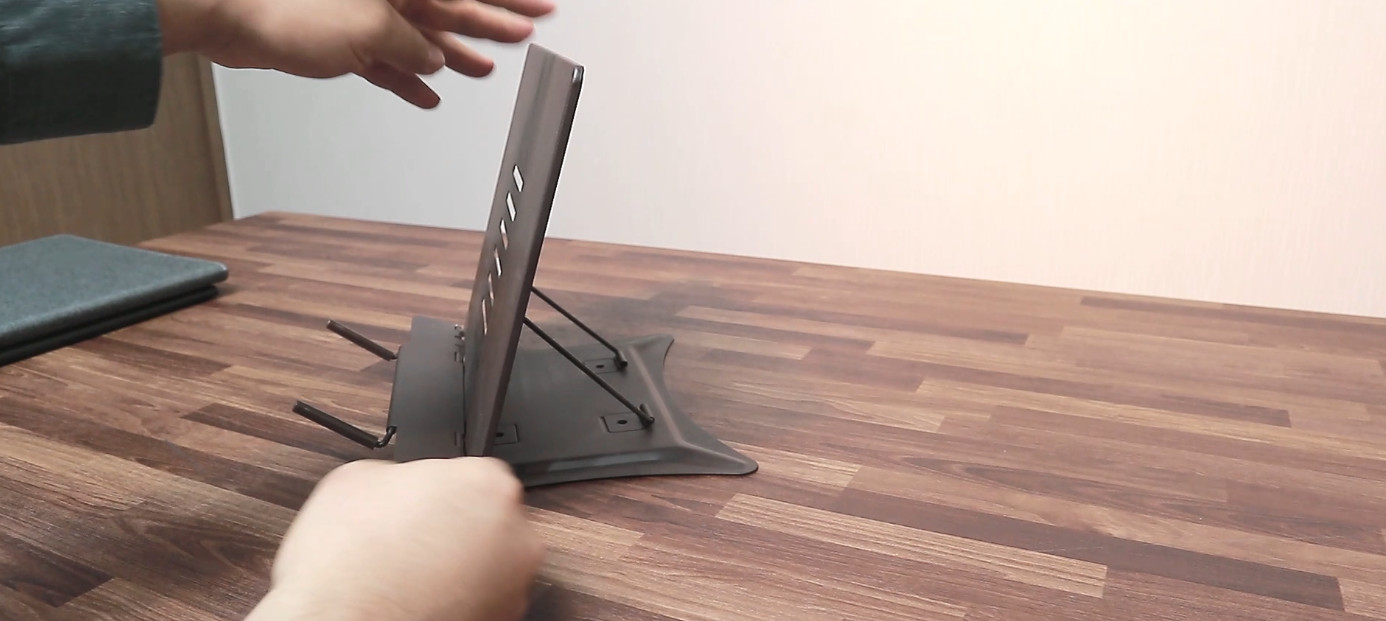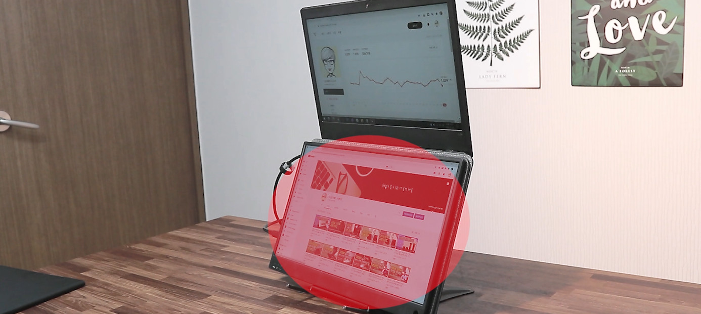 그리고 독서대의 각도를 높여 노트북을 거치하고 그 위에 휴대용 모니터를 올려 사용하죠. 간단한 문서작업은 문제 없지만 영상작업이나 게임과 같이 CPU 사용량이 많은 작업을 하면 키보드 부분으로 열기가 올라오게 되고 모니터가 그 열기를 막는 역할을 하게 됩니다.