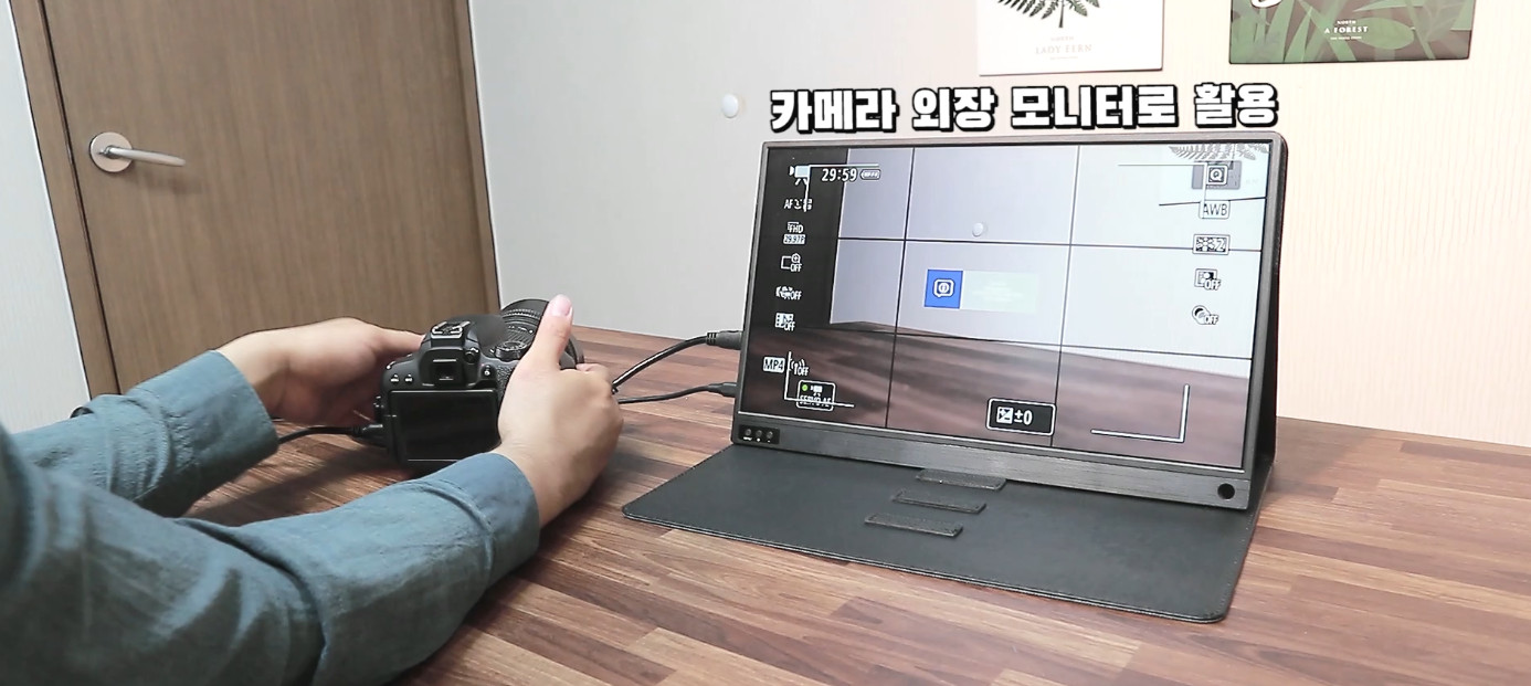 저는 유튜브 촬영을 보통 혼자서 하는데, 휴대용 모니터를 DSLR의 모니터로 활용하기도 합니다. 보통 카메라 모니터의 사이즈가 5~9인치 정도인데, 휴대용 모니터는 15.6인치이기 때문에 시각적으로 쉬운 확인이 가능하죠. 물론 야외에서 사용하는 것은 힘들지만 저와 같이 실내촬영이 많다면 충분히 유용하게 사용할 수 있습니다.