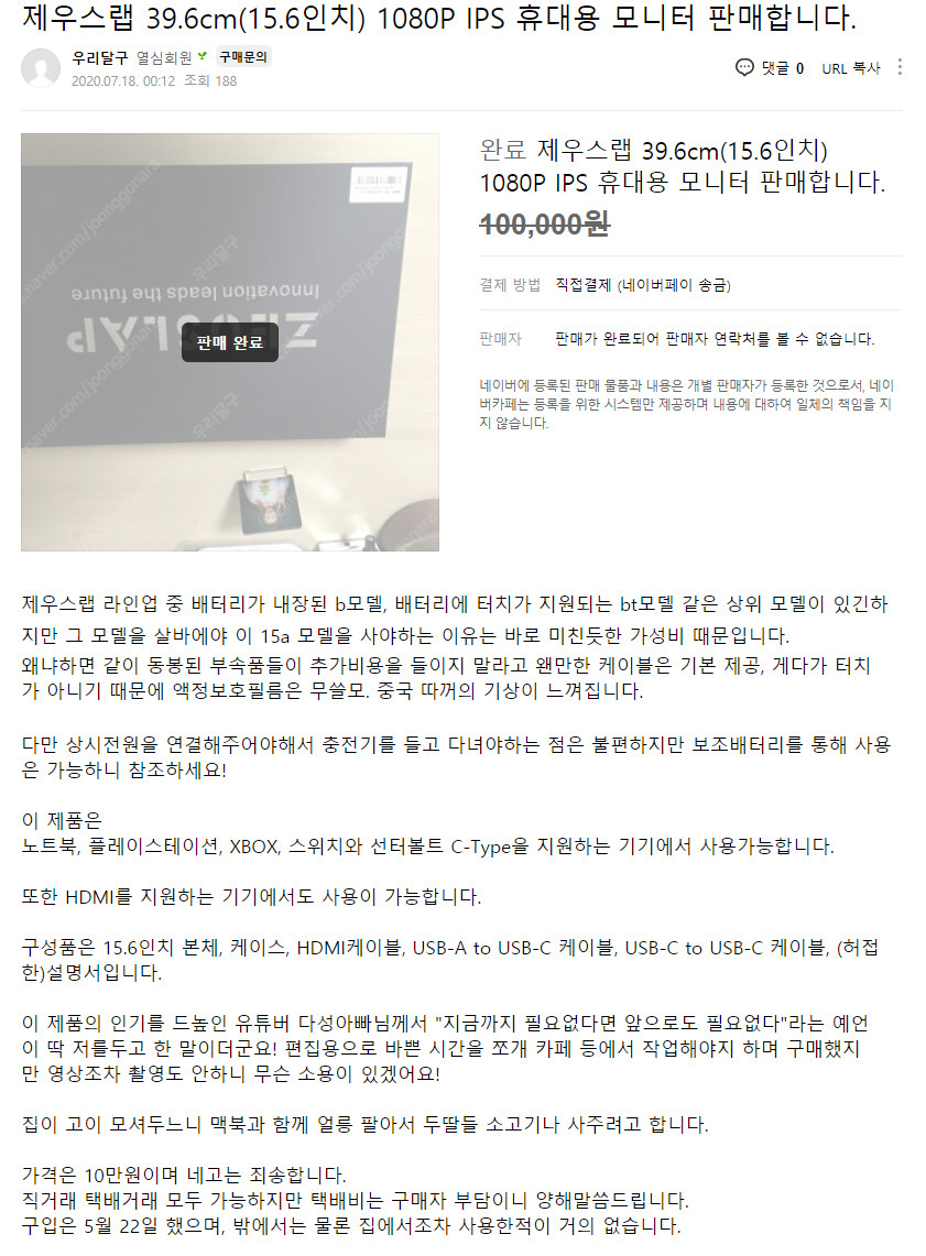 중고나라에서 제우스랩 휴대용 모니터를 판매하는 글인데 제 이름이 언급되어 있다고 해서 지인분이 보내줬습니다.