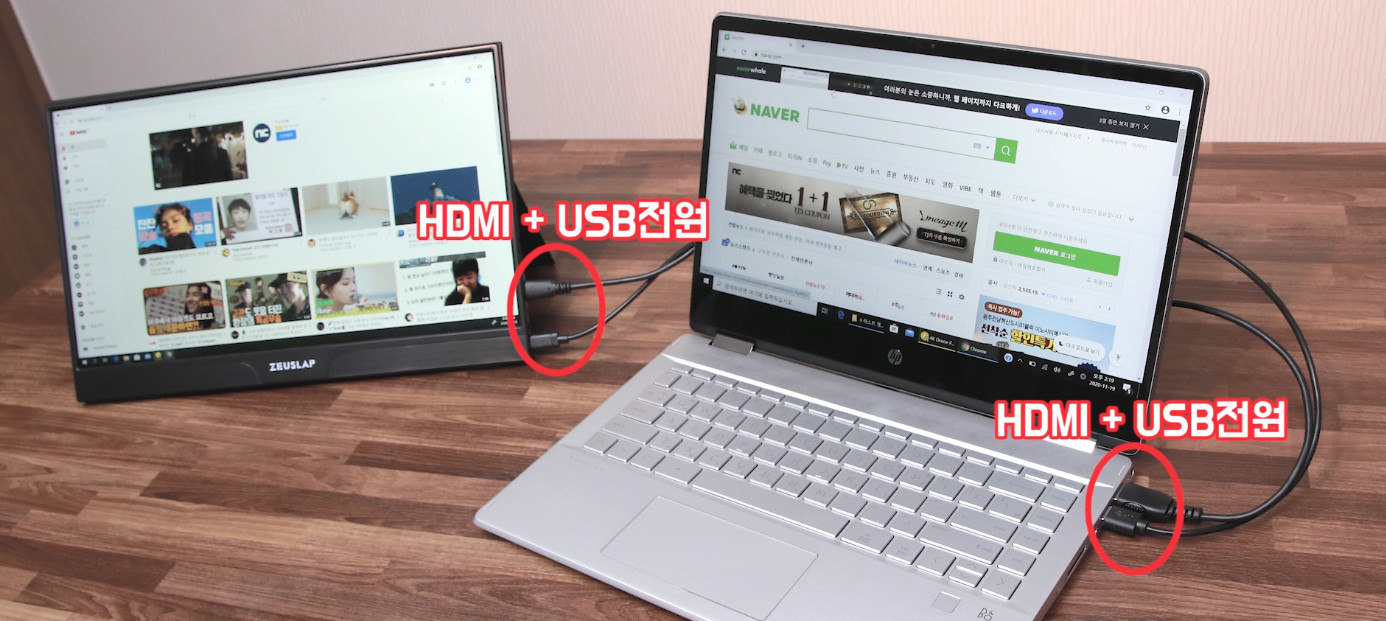 그렇기 때문에 동봉 되어있는 HDMI to MINI HDMI케이블과 USB케이블을 이렇게 연결해 보세요. 길이까지 맞추면 더 좋겠죠.