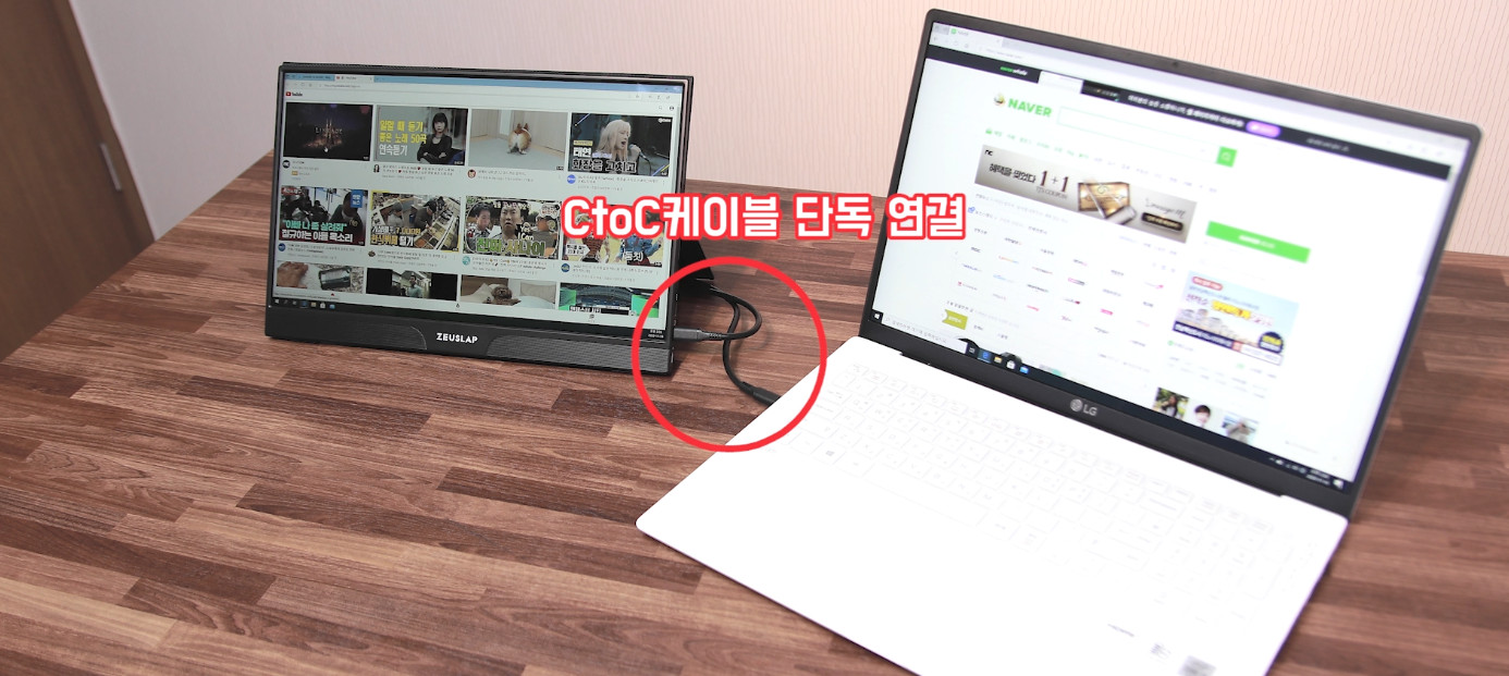 이런 휴대용 모니터는 노트북에 연결할 때 CtoC케이블로 연결하는 것이 깔끔하고 좋죠. 하지만 CtoC를 사용하려면 본인의 노트북이 썬더볼트나 모니터 출력 가능한 C단자를 지원해야 하는데, 저가형 노트북은 거의 지원하지 않습니다.