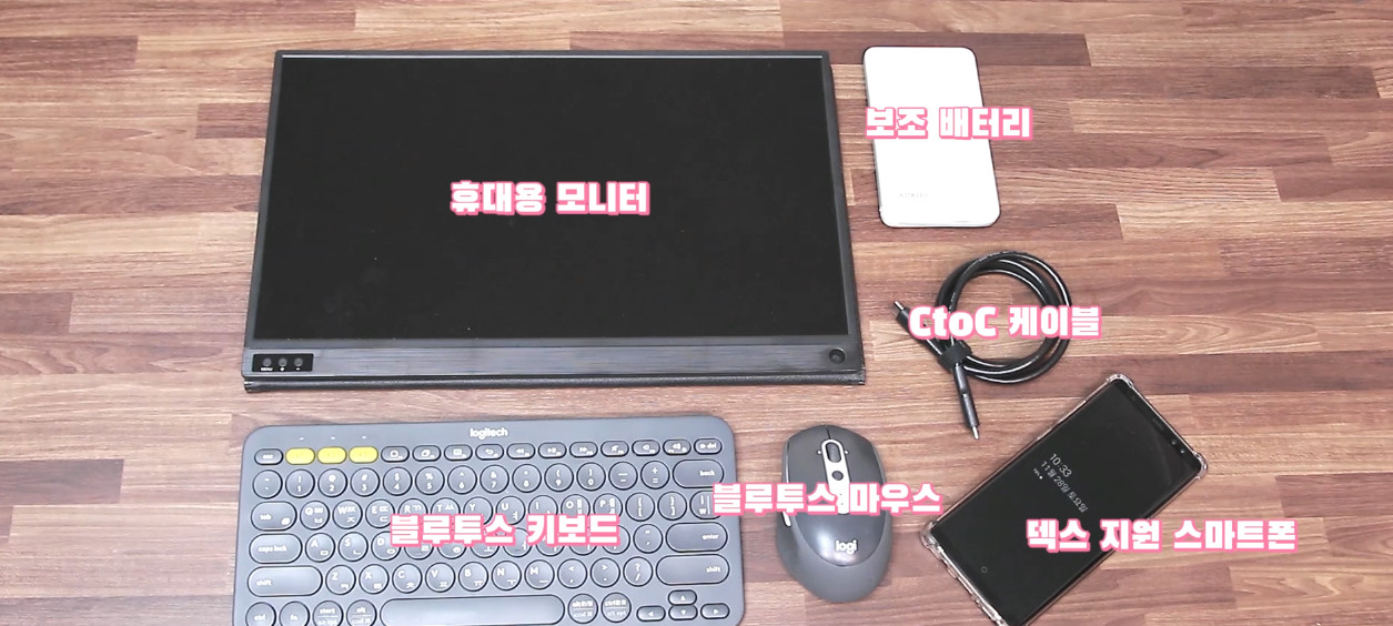 휴대용 모니터, 휴대용 모니터 전력 공급용 보조 배터리, 블루투스 키보드, 블루투스 마우스, CtoC 케이블, 덱스 지원 스마트폰