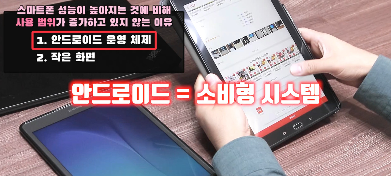 기본적으로 안드로이드 운영 체제는 편하게 화면 터치를 기반으로 하는 소비형 시스템으로 볼 수 있죠. 하지만 안드로이드 역시 시간이 지나면서 생산형 어플들이 아주 잘 나오고 있습니다. MS 오피스나 한글 작업도 안드로이드 시스템으로 충분히 가능하죠. 하지만 여기서 더 진행될 수 없는 이유가 바로 작은 화면입니다. 스마트폰이 커봤자 5~6인치, 태블릿이 커봤자 10인치인데, 이 사이즈로 어떻게 지속적인 생산활동이 가능하겠어요.