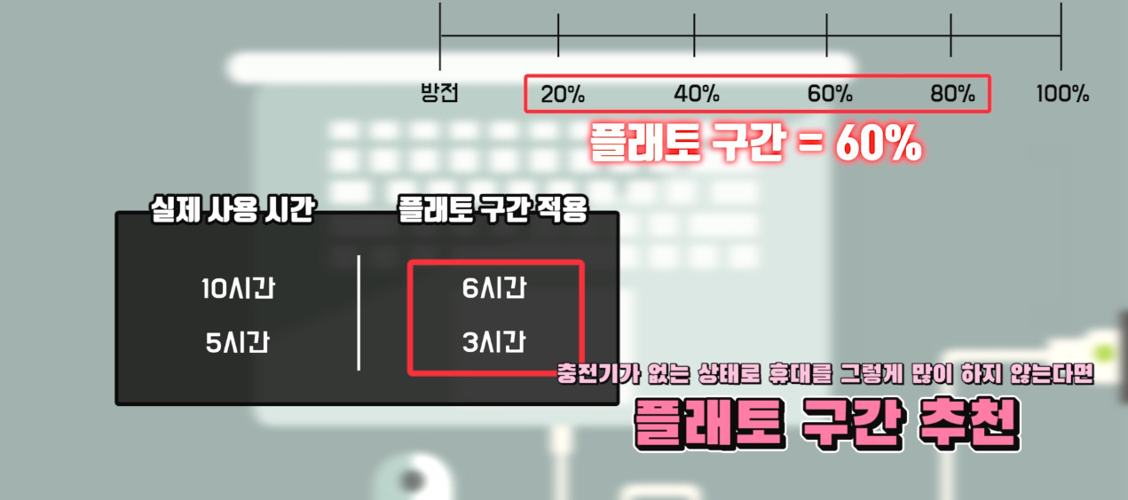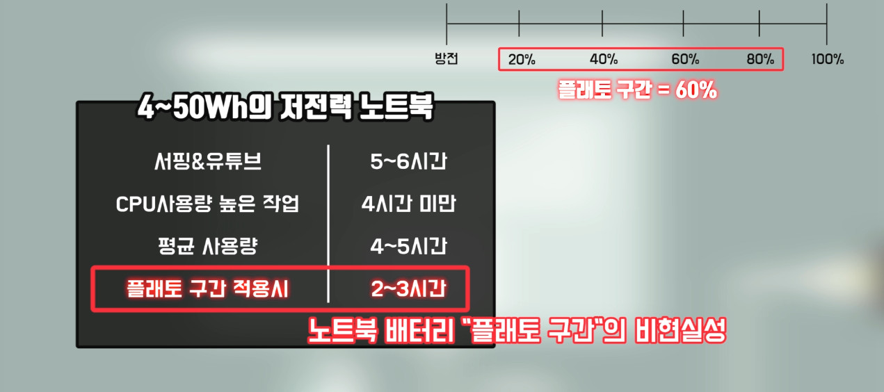 플래토 구간은 배터리 총 양의 60% 밖에 되지 않습니다. 원래 노트북이 갖는 사용 시간 대비 60% 밖에 사용하지 못한다는 거죠.