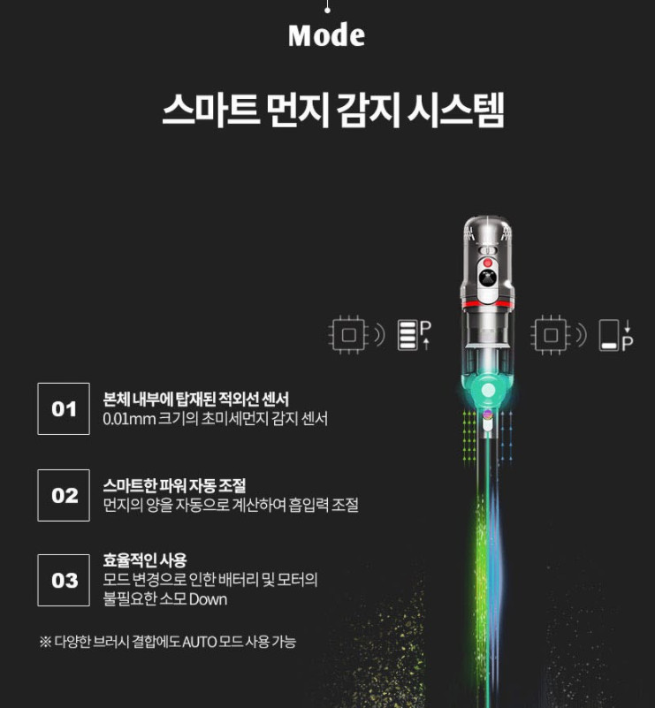 모드는 3가지가 있습니다. 가장 강력한 슈퍼 모드, 먼지의 양을 센서로 감지해서 그것에 맞는 출력이 나오는 자동 모드, 배터리를 가장 오래 사용할 수 있는 에코 모드.
