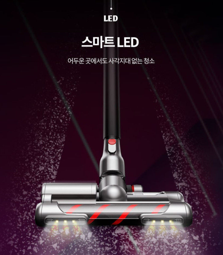 전동 블러시에 LED가 달려있는데, 청소기를 밤에 돌릴 일은 거의 없고, 어두울 때 청소 할 일이 역시 거의 없기 때문에 그렇게 유용한 기능이라고 생각하지는 않습니다. 물론 어두울 때 청소한다면 정말 좋을 수 있겠죠.