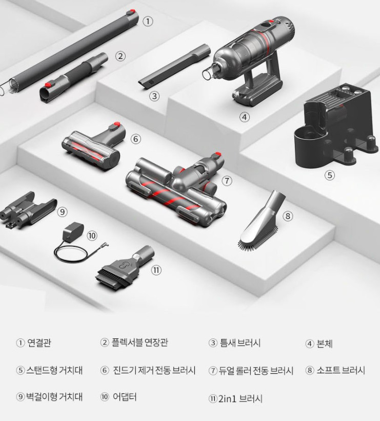 이 제품을 실 사용 해보니 높은 출력은 사실 크게 와 닿지는 않았고 오히려 이 구성품들에서 큰 만족감을 얻었습니다. 제가 가지고 있는 어떠한 청소기들 보다 구성품들이 화려하고 또 실용적입니다.