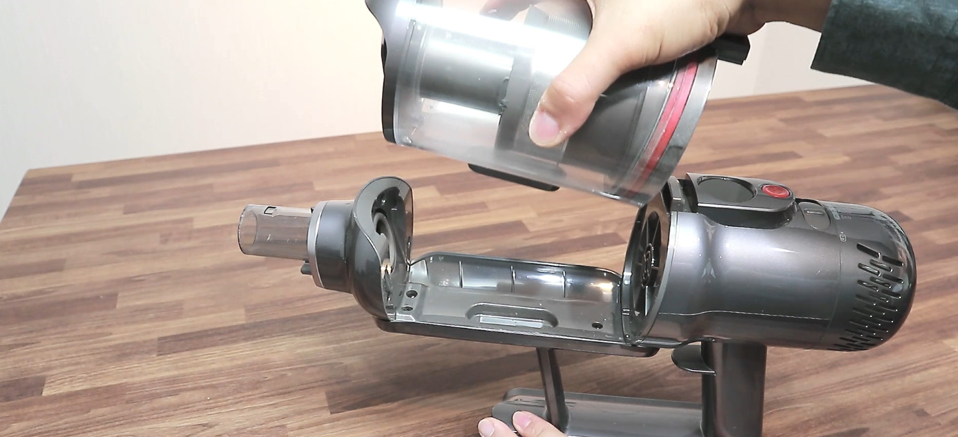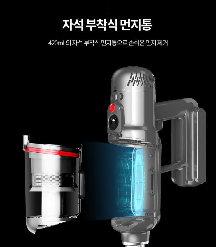 먼지통은 별도의 시건 장치가 없고 자석으로 결합하기 때문에 편리하게 제거가 가능 하지만 실수로 청소기를 떨어트리면 당연히 먼지통이 분리되고 청소한 먼지가 다 날아다닐 수 있습니다. 개인적으로 좀 더 불편하더라도 시건 장치가 필요하다고 생각 됩니다.