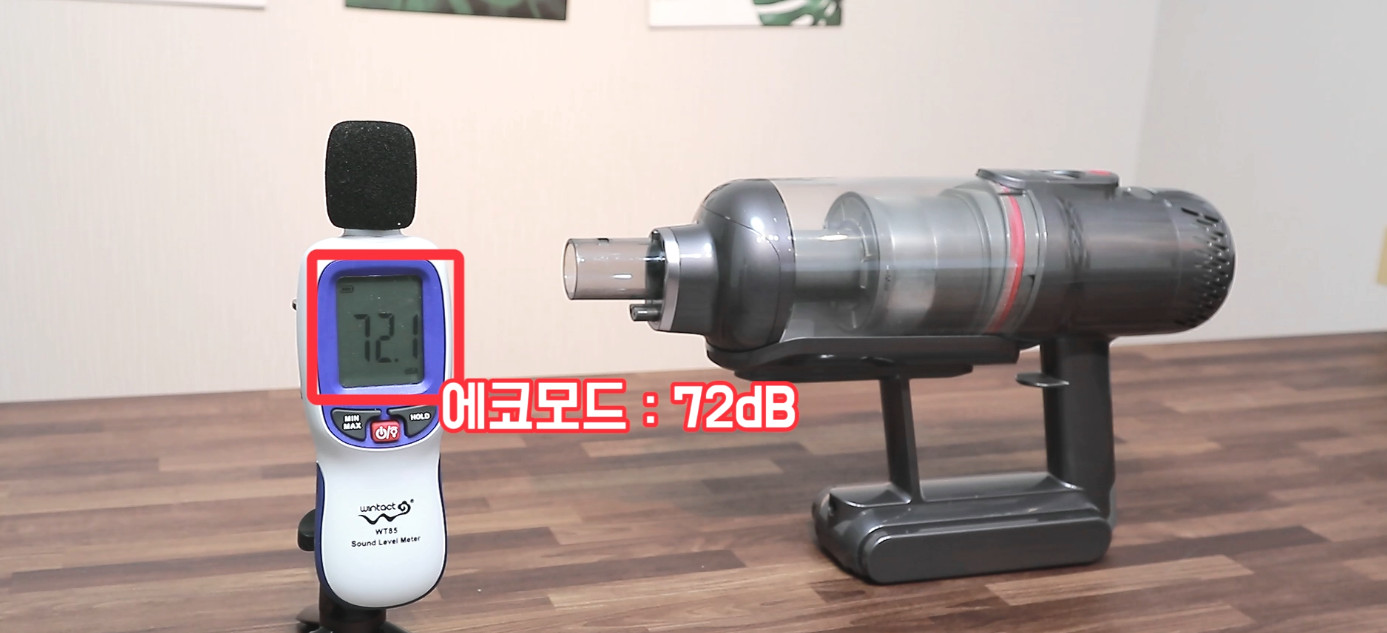 자사 광고에서는 다이슨 보다 조용하다고 하는데 제가 봤을 때에 큰 차이는 없습니다. 제가 가지고 있는 청소기들 대부분이 최대 세기에서 80dB 정도가 나오고 이 제품도 딱 그정도 수준입니다.