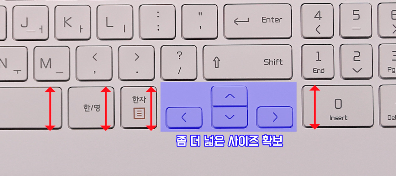 그램의 방향키는 이온과 같은 형식으로 보이지만 자세히 보면 맨 아랫줄 키의 세로 사이즈를 늘려 방향키 사이즈를 좀 더 확보하고 있죠. 그래서 방향키의 사이즈가 좀 더 넉넉하고 사용하기 훨씬 좋습니다.