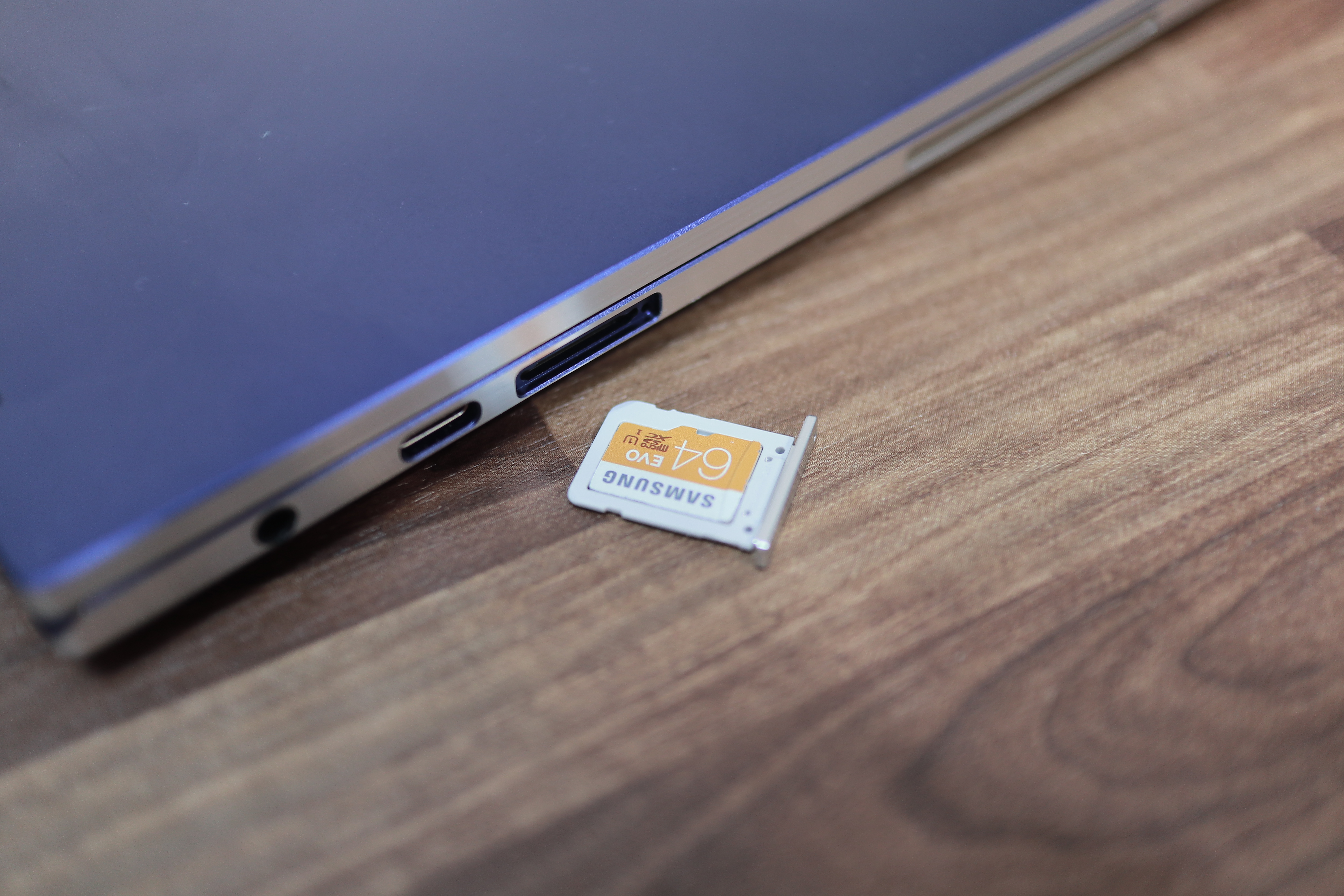 트레이형은 뽀족한 무언가가 없으면 사용이 불가능하기 때문이죠. 그런데 직접 사용해 보니 왜 이렇게 만든지를 알겠더라고요. 우리가 일반적으로 생각하는 다양한 SD카드의 사용 목적이 아닌 노트북 용량 확장을 위한 저장장치라고 볼 수 있습니다. 어느정도 UFS를 고려했겠죠. 용량 확장이 목적이라서 실수로 빼거나 충격으로 빠지면 안되기 때문에 이러한 형태의 슬롯이 더 안정적이죠. 그래서 사용의 편리함으로 따지면 그램이 좋고, 장기적인 사용에 의한 안정성으로 따지면 이온이 좋다고 평가할 수 있습니다.