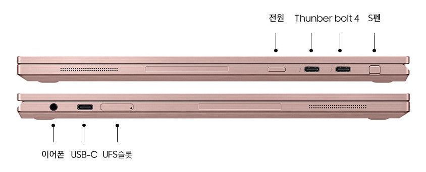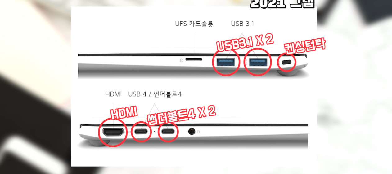 2021 그램부터 자체적인 전원 포트를 제거하고 썬더볼트4를 2개 넣었습니다. 확장성도 좋고 충전에 대한 범용성도 아주 좋아졌죠. 지금 2021 그램의 포트구성은 프리미엄 윈도우 노트북의 진화 된 형태로 여기서 그만 진화 했으면 좋겠다라는 생각이 들정도로 아주 좋은 형태의 포트구성입니다.