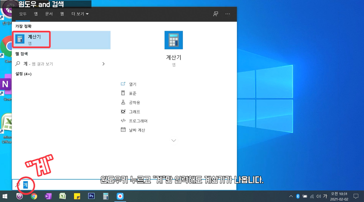 윈도우키 누르고 "계"만 입력해도 계산기가 나옵니다. 바로 실행하면 되죠.