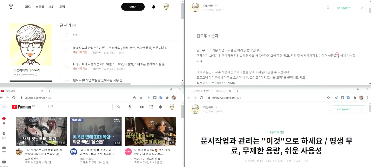 여기서 한 가지 더 추가하자면 이 창을 오른쪽 왼쪽이 아닌 모서리에 이동시키면 이렇게 4분의1 분할 화면이 설정됩니다. 화면을 좀 더 세분화 시켜 사용할 수 있죠.