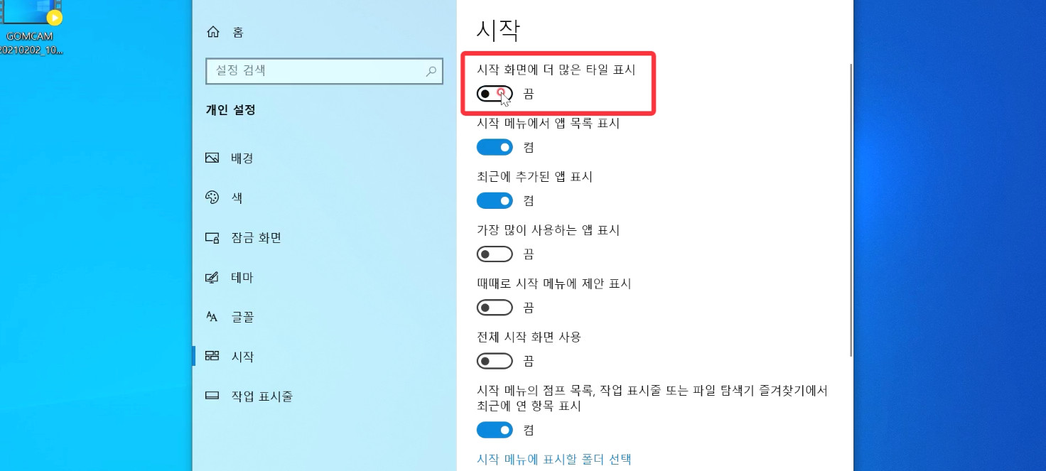 첫 번째 "시작 화면에 더 많은 타일 표시"를 체크하면 저와 같이 시작화면을 좀 더 넓게 사용할 수도 있습니다.