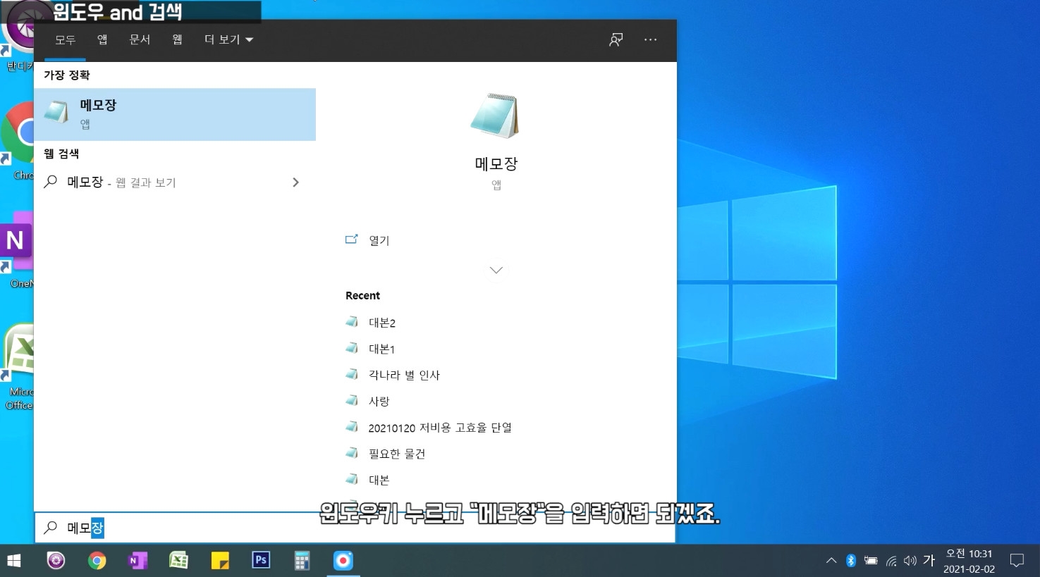 윈도우키 누르고 "메모장"을 입력하면 되겠죠.