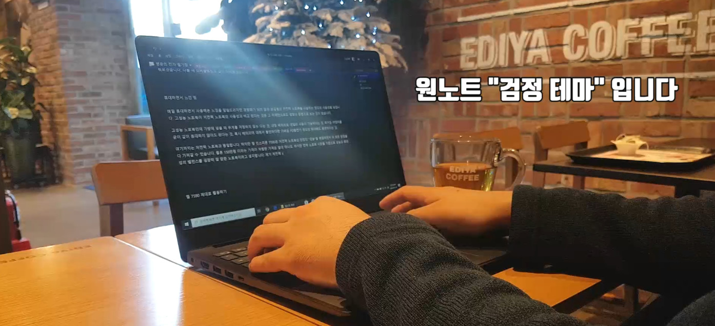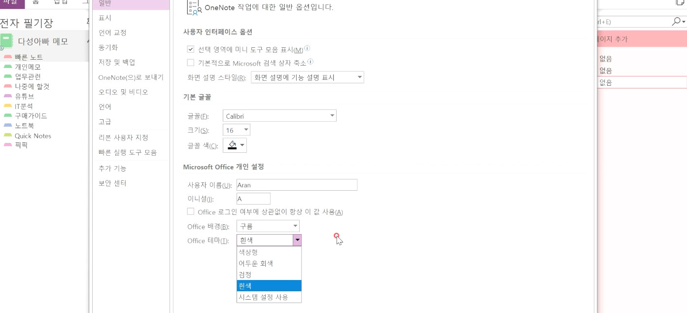 흰 바탕의 화면이 기본적으로 밝기 때문에 너무 오래 보고 있으면 눈에 무리가 와서 종종 검정 바탕의 테마를 사용합니다. 이렇게 테마를 자유롭게 바꿀 수 있는 것도 원노트 2016에서 가능합니다.