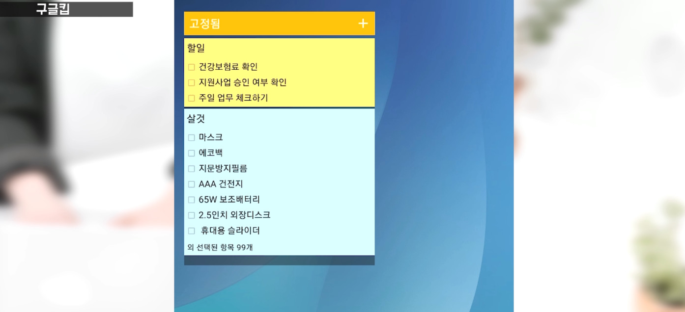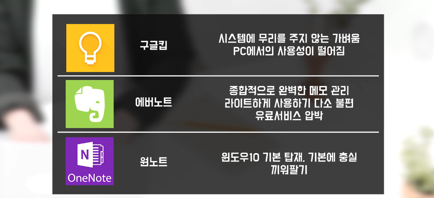 노트북 보다 스마트폰에서의 사용량이 많다면 그리고 간단한 메모 위주라면 구글킵이 좋습니다. 어플자체가 굉장히 가볍고 동기화의 딜레이가 거의 없습니다. 그리고 스마트폰 사용시 위젯을 효율적으로 사용할 수 있습니다. 하지만 PC로 사용할 때는 크롬의 확장프로그램으로만 접근할 수 있기 때문에 PC 사용성은 상대적으로 좀 떨어진다고 볼 수 있습니다.