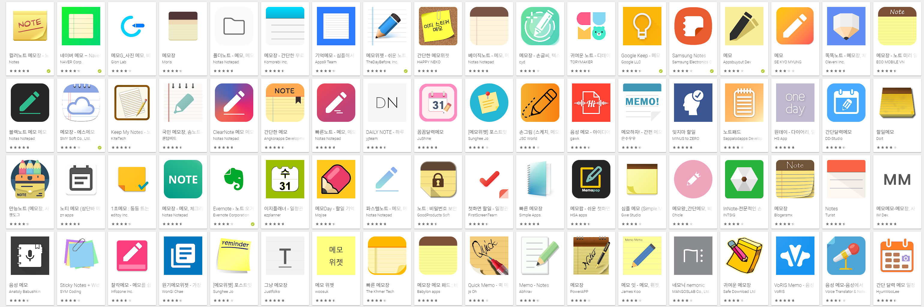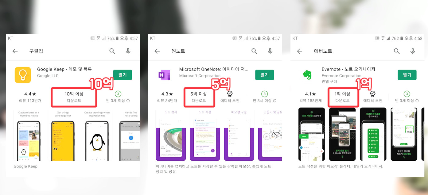 플레이스토어 기준 구글킵이 10억, 원노트가 5억, 에버노트가 1억 정도의 다운로드를 보이고 있습니다.