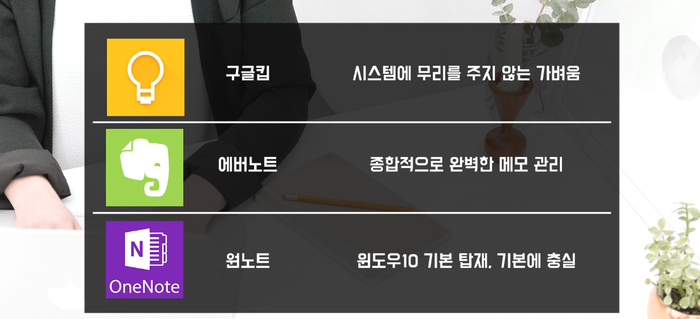 다양한 메모 어플이 있는데 이것저것 여러 개 사용하는 것은 자료가 분산되기 때문에 추천하지 않습니다. 본인에게 가장 잘 맞는 한 개만 선택해서 지속적으로 사용하는 것이 가장 좋습니다.
