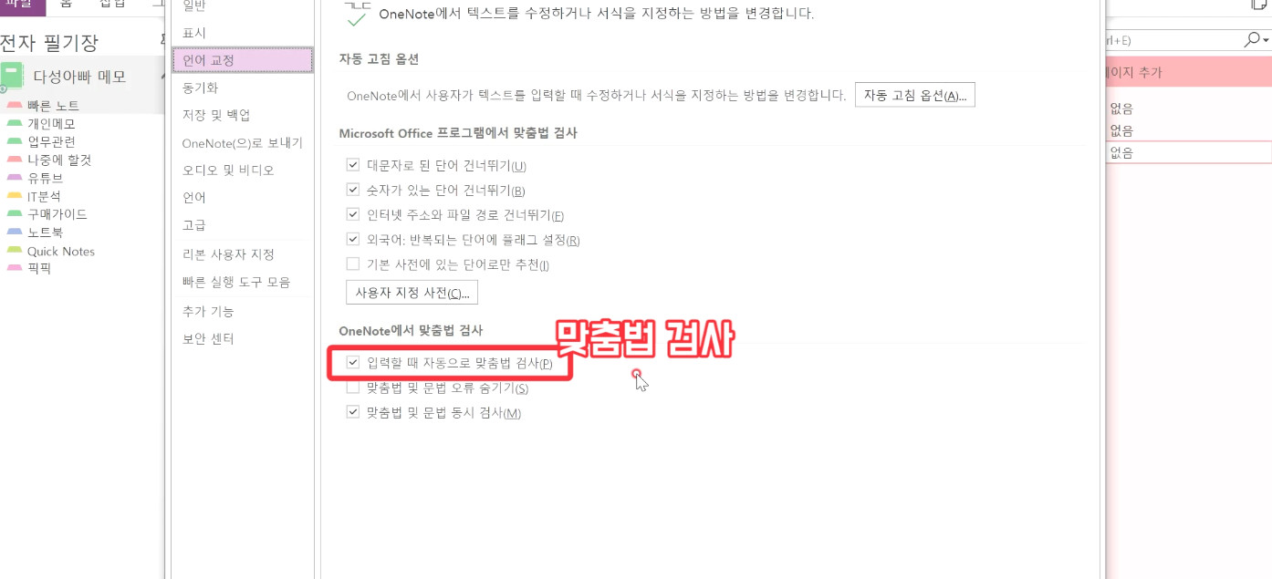 저는 맞춤법 검사를 기본적으로 사용합니다. 원노트의 맞춤법 검사는 한컴 오피스나 네이버 블로그 교정 대비 조금 떨어지긴 하지만 가볍게 참고하기에 나쁘지 않다고 생각합니다.