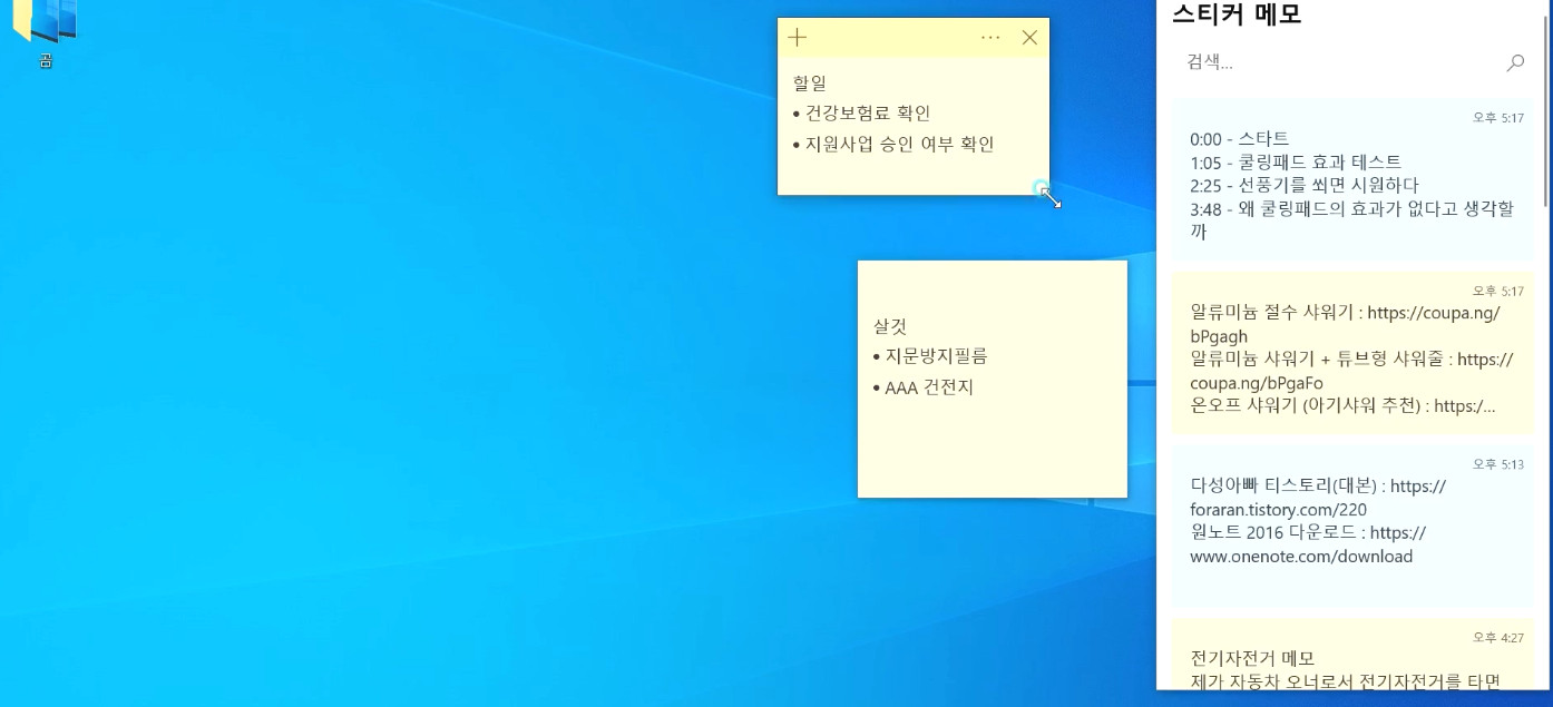 그래서 아주 간단한 메모, 예를 들어 오늘의 할일, 오늘의 업무, 약속 이렇게 소모적인 짧은 메모들은 스티커 메모로 띄어 놓고 제대로 된 문서작업이 필요한 것들은 원노트로 작업을 하고,