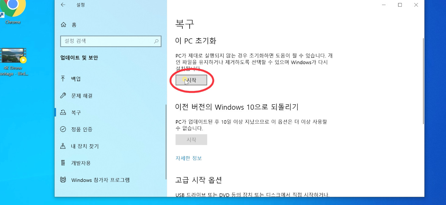 설정 - 업데이트 및 보안 - 복구