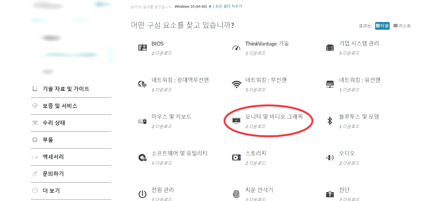 외장그래픽이 있다면 혹은 좀 더 확실하게 드라이버를 잡기 위해서는 제조사 홈페이지에서 제공하는 파일들을 설치하면 됩니다. 보통 제조사 홈페이지 고객지원 메뉴에서 노트북 바닥이나 박스에 있는 노트북 제품명, 혹은 시리얼 번호로 검색하면 다운로드 페이지가 나옵니다.