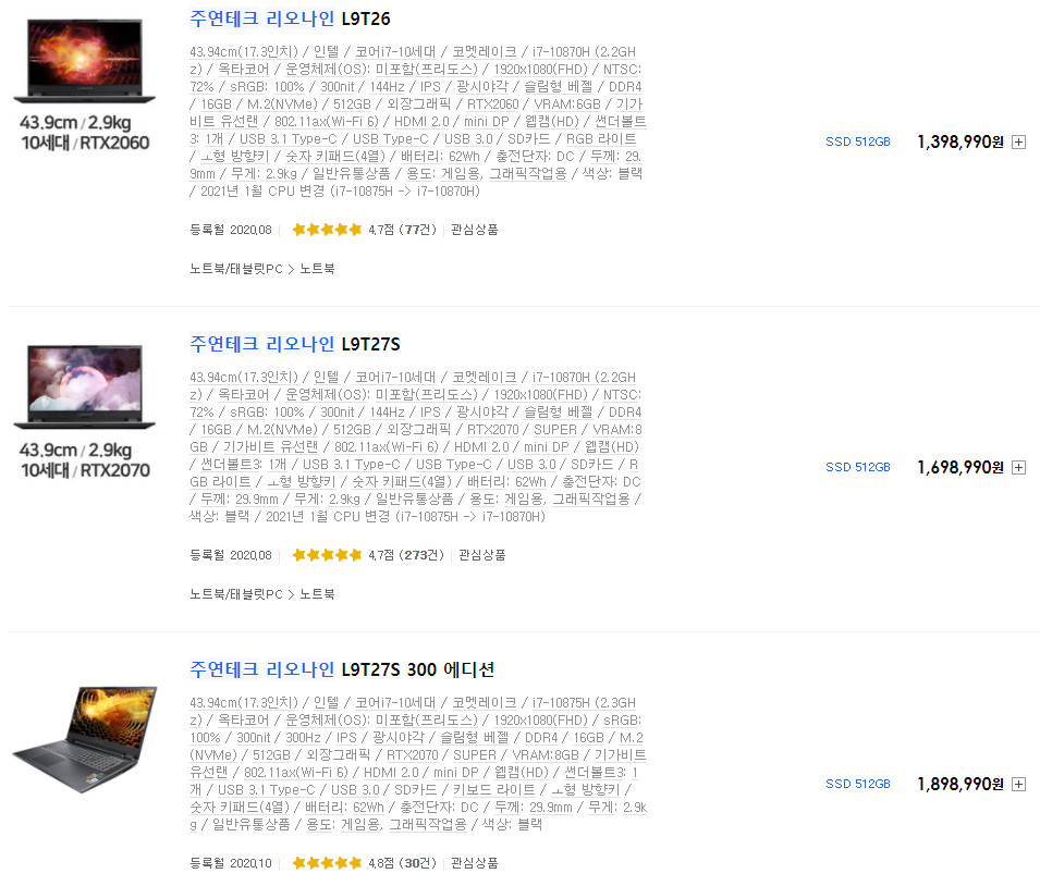 지금 주연테크 리오나인 고성능 노트북들은 전부 가성비가 좋습니다. 여러 모델들이 있는데 전체적으로 다 좋습니다.