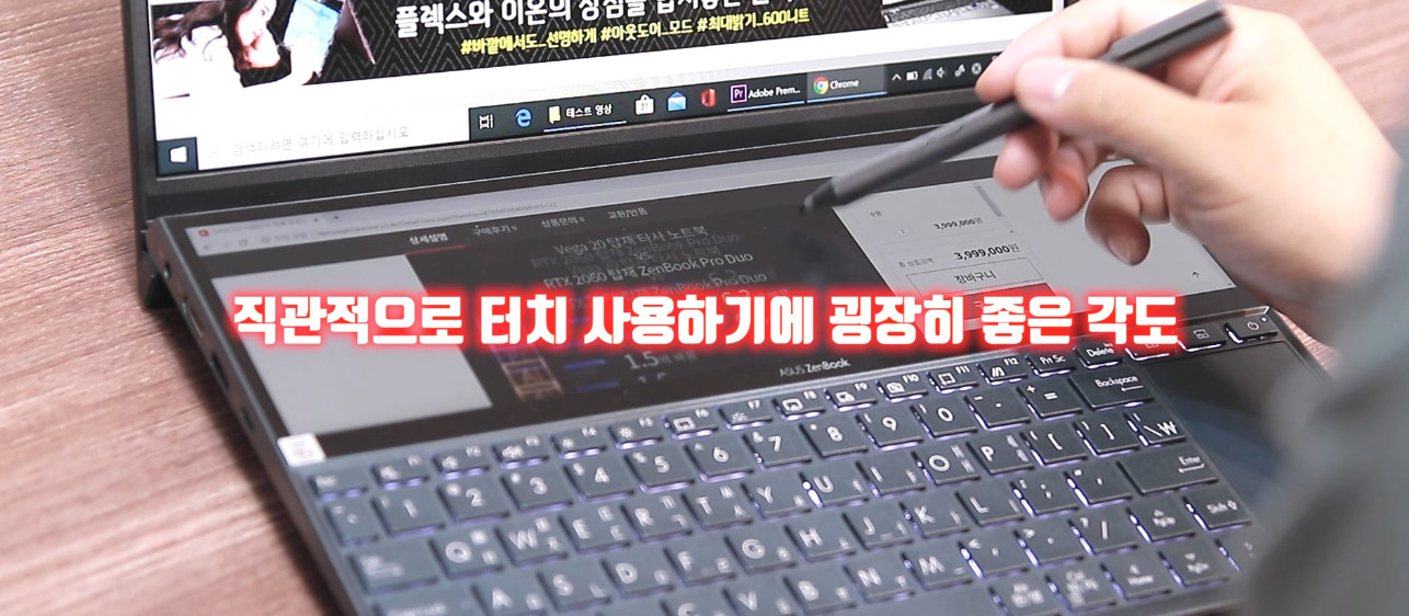 듀얼 스크린의 각도가 많이 눕혀져 있다고 생각이 들겠지만 직관적으로 터치 사용하기에 굉장히 좋은 각도이고 메인이 아닌 보조로 사용하기에 전혀 부족함이 없었습니다.