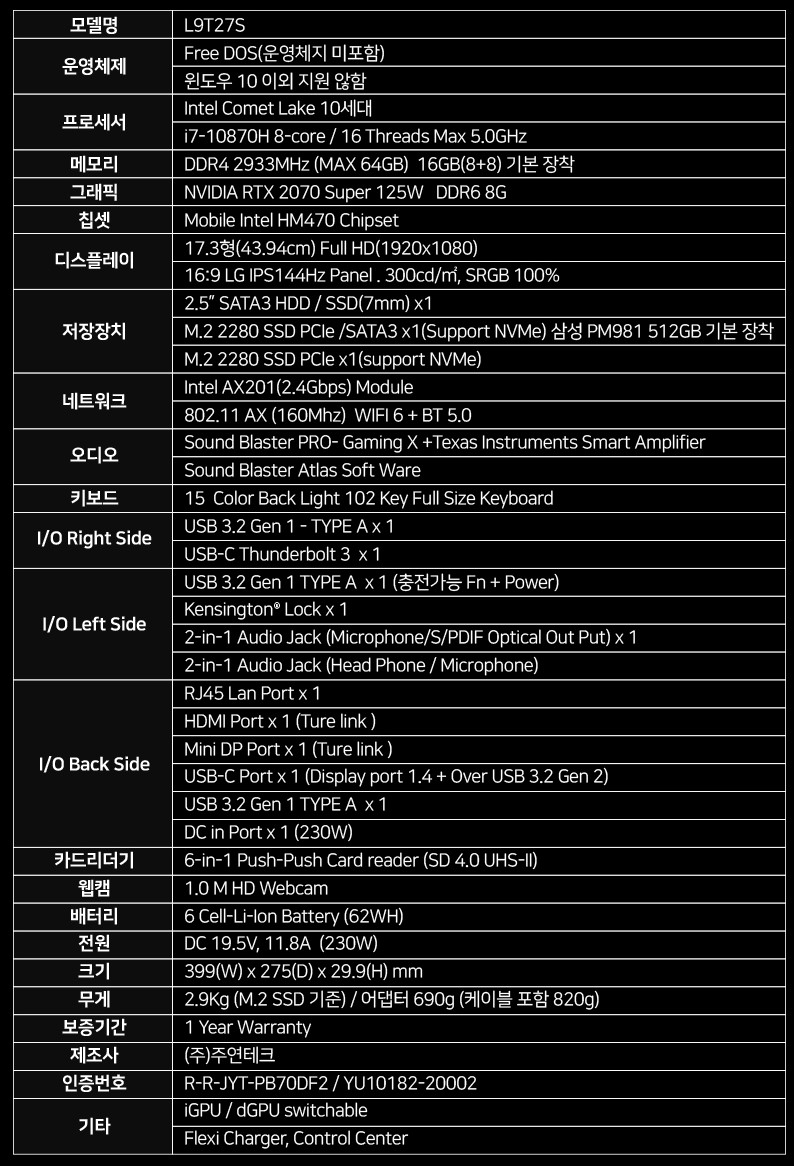 이 노트북은 성능 대비 가격이 워낙 저렴하기 때문에 스펙시트로는 깔 부분은 없어요. 좋은 기능들 다 들어있습니다. 그리고 17.3인치에 고성능 노트북은 보통 거치용으로 사용하기 때문에 무게로 까는 것은 큰 의미가 없습니다.