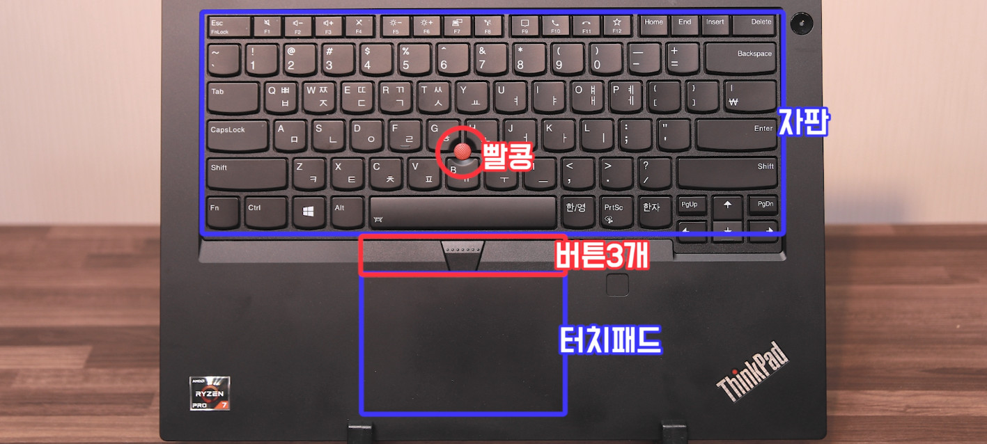 보통 노트북 키보드는, 크게 자판과 터치패드로 나뉩니다. 그리고 씽크패드는 여기에 빨콩과 3개의 버튼이 추가로 더 있습니다.