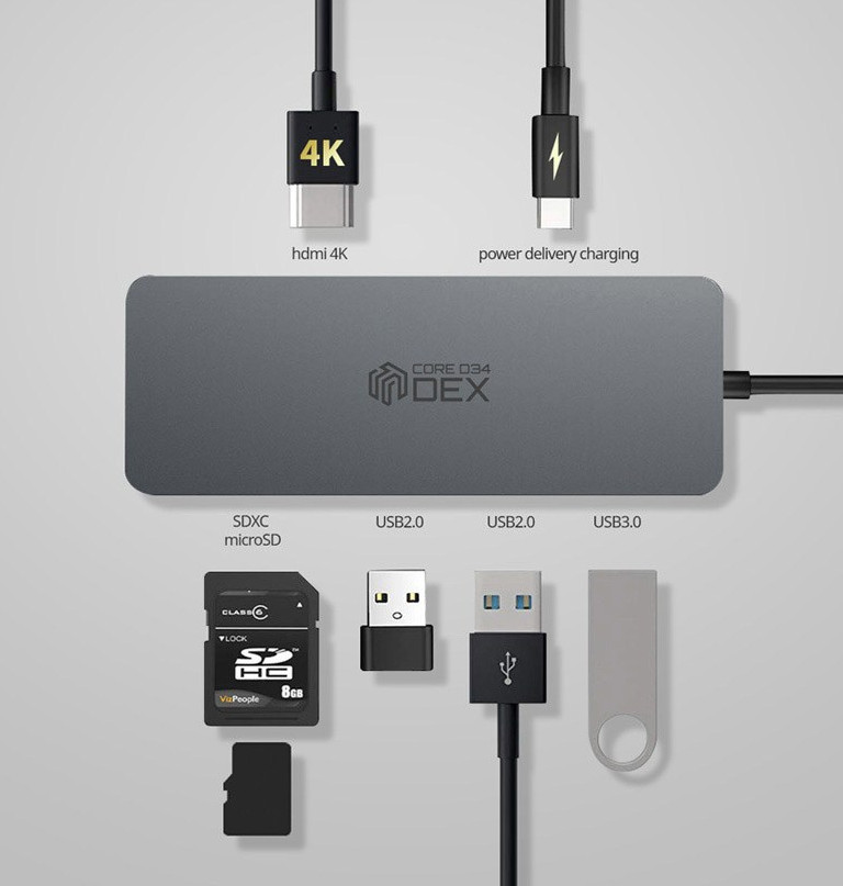 바로 데스크탑 모드가 됩니다. 노트북의 도킹스테이션과 동일한 시스템인데 기술의 발전으로 훨씬 심플해진거죠. 전송속도가 높기 때문에 이 C타입 단자 하나로 노트북에 필요한 모든 외부 기능들을 추가할 수 있습니다.