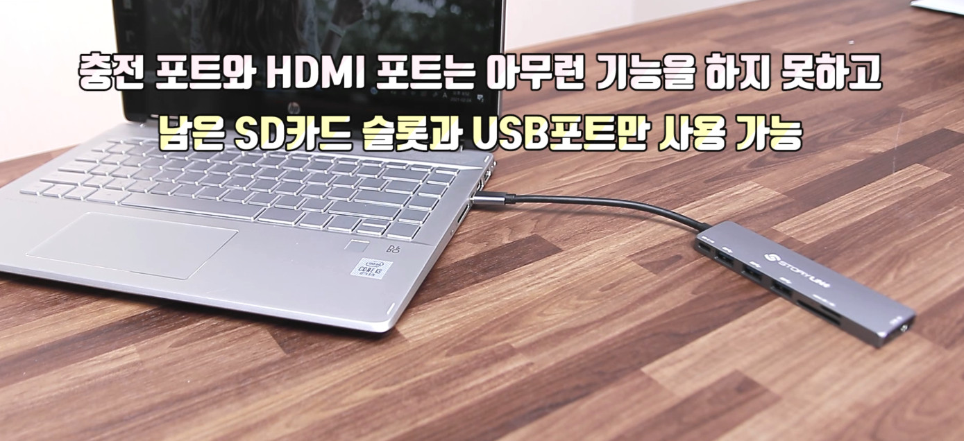 여기에 이 PD멀티허브를 연결하면 당연히 충전 포트와 HDMI 포트는 아무런 기능을 하지 못하고, 남은 SD카드 슬롯과 USB포트만 사용 가능합니다.