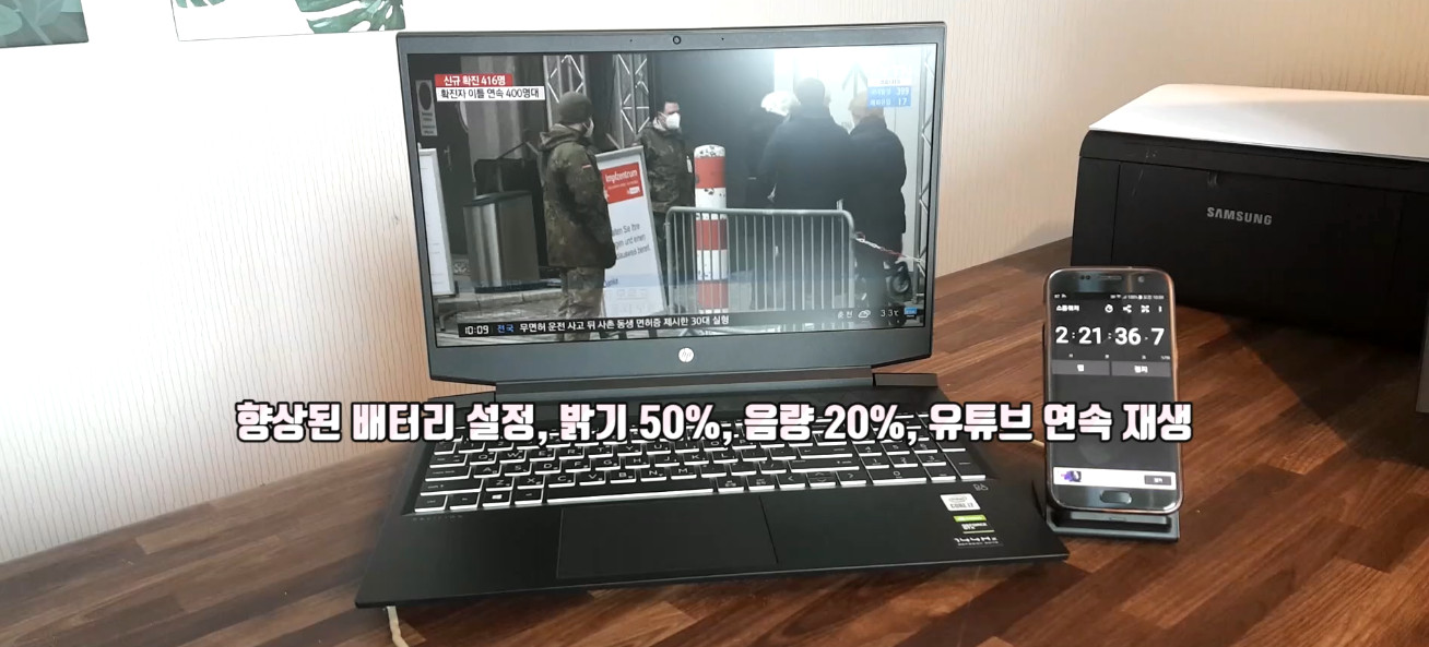 향상된 배터리 설정 된 상태에서 밝기 50% 음량 20% 유튜브 연속 재생을 했습니다.