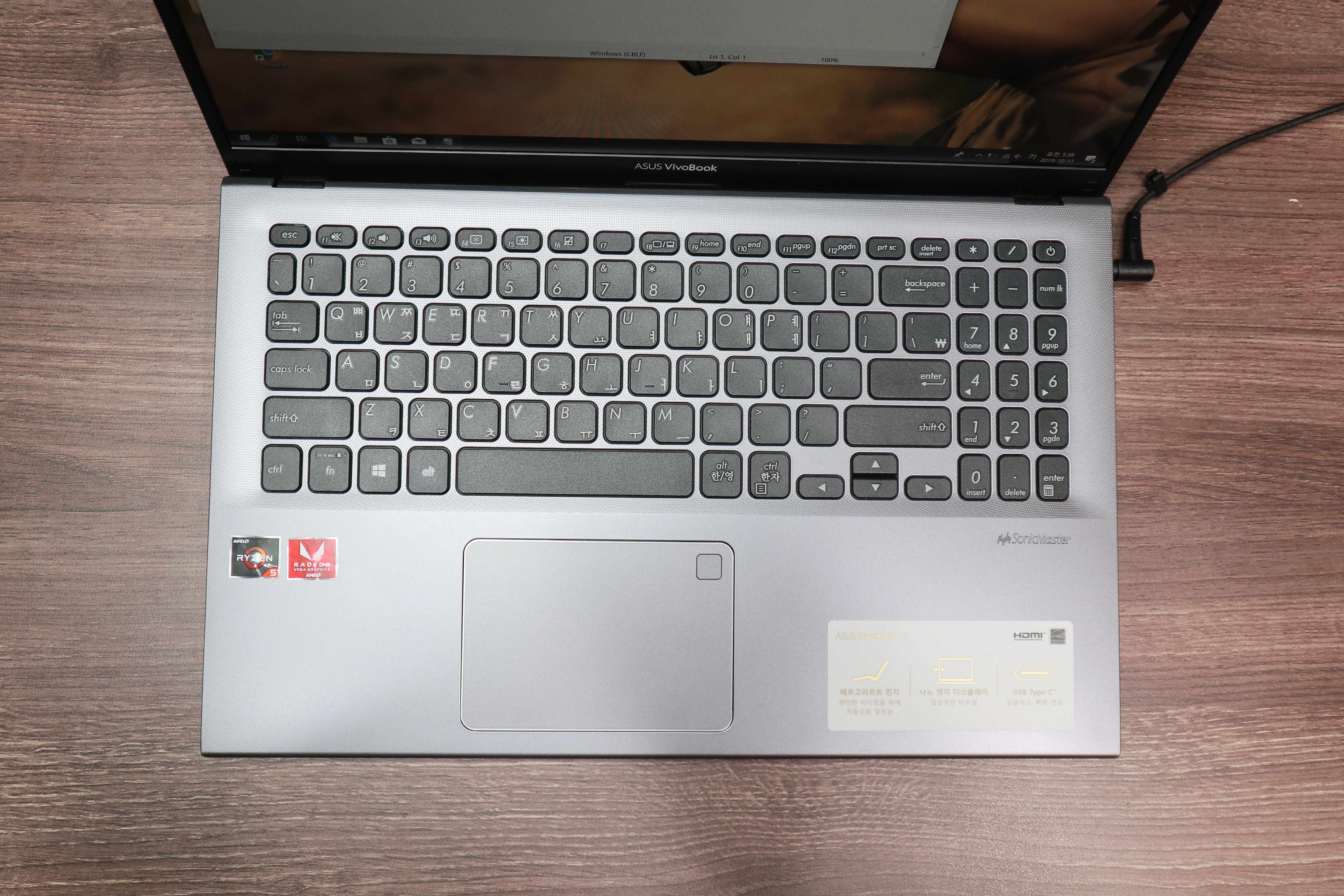 그래서 이 전 모델은 15.6인치인데 숫자패드를 완전 제거한 텐리스 키보드였어요. 15.6인치도 불구하고 완전히 정면을 바라보는 타이핑 포지션을 가진 노트북 이였죠. 그런데 아무래도 비보북만의 아이덴티티보다 상업적 가치를 고려하다 보니 2019년 부터 숫자패드가 들어 갔는데 깔끔하게 3줄로, 거기다가 키캡의 크기도 굉장히 작게 오른쪽으로 최대한 붙여 넣었습니다.