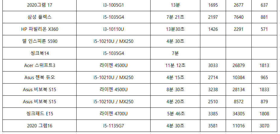 인텔 10세대와 MX250을 사용하는 노트북과 비슷한 시간입니다.
