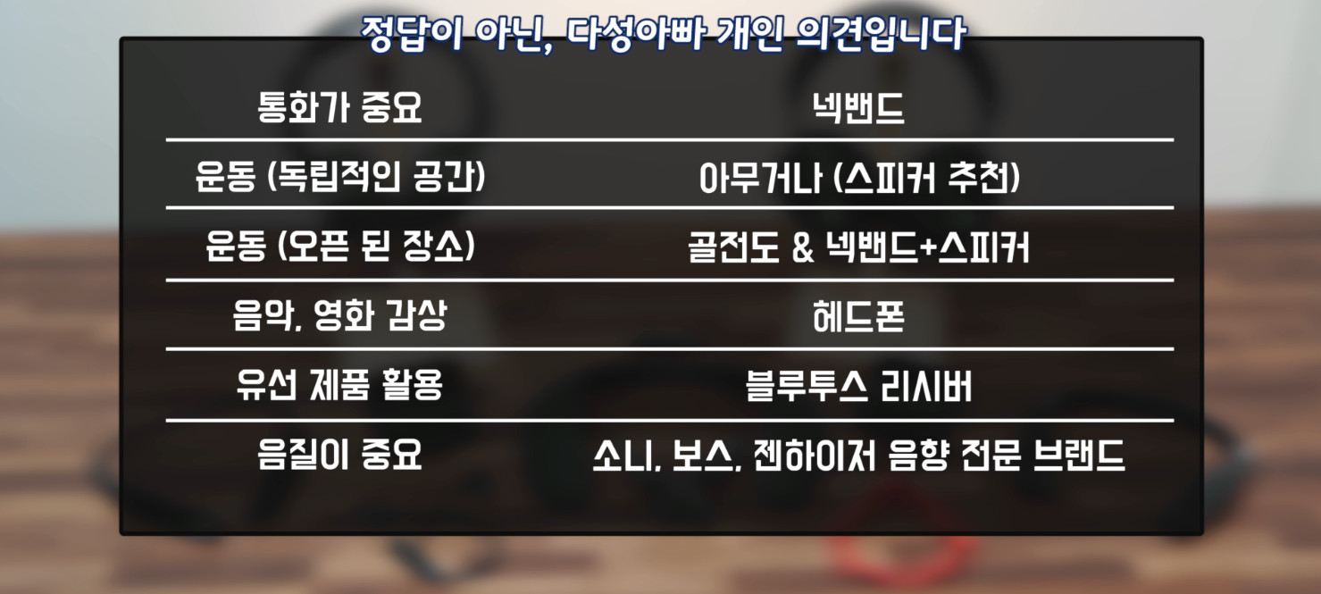 반면 오픈 된 장소에서는 내 행동이 남에게 피해를 줄 수 있기 때문에 주변 소리가 들릴 수 있는 제품이 좋습니다. 골전도 이어폰과 스피커가 달린 넥밴드형 이어폰이 좋죠.