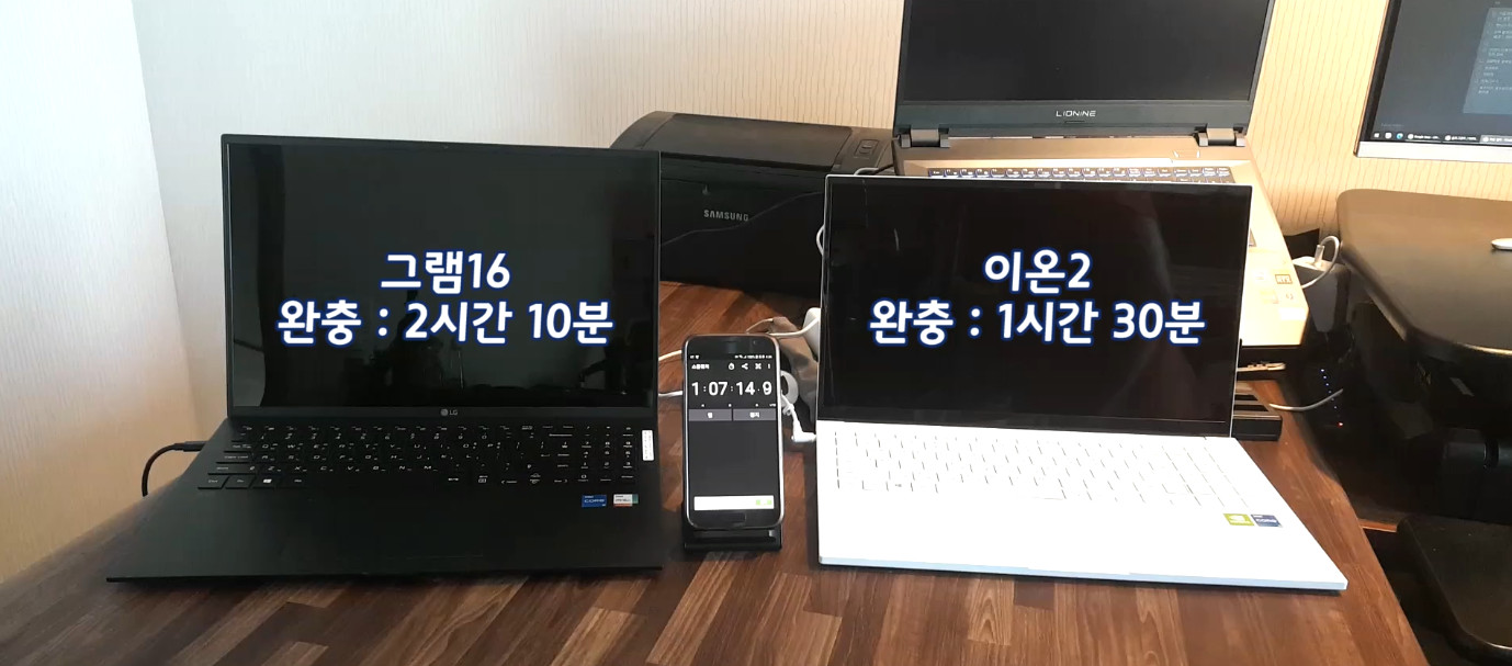 이온 충전기는 60W 정도그램 충전기는 50W 정도로 그램이 출력이 많이 낮네요.